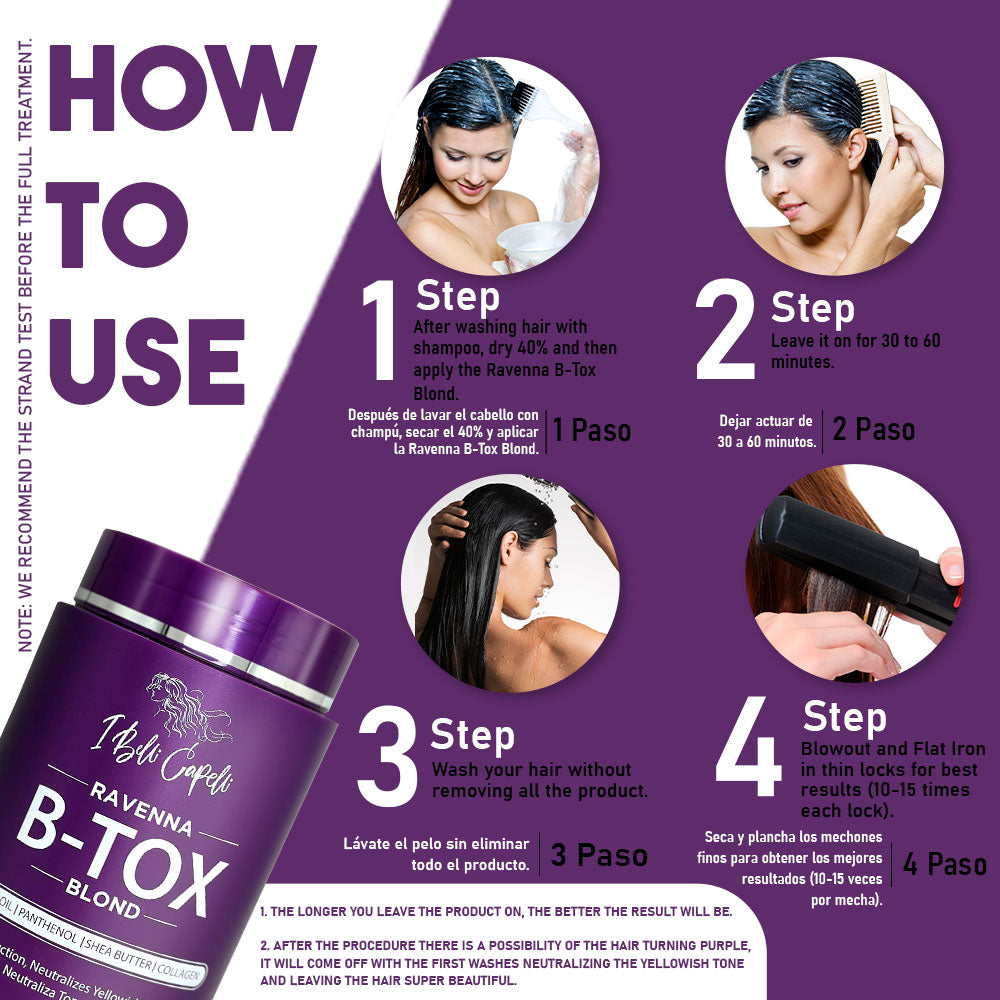 1. B-tox Blond: After washing your hair with a clarifying shampoo, partially towel-dry (approximately 40%) and apply the B-tox Blond. Leave it on for 15 to 30 minutes, depending on the desired effect. The longer it stays on the hair, the straighter it will be and the more yellow tones will be neutralized. Section hair into thin strands, blow-dry completely, and flat iron. Once the hair has cooled, rinse lightly if needed and style as desired.