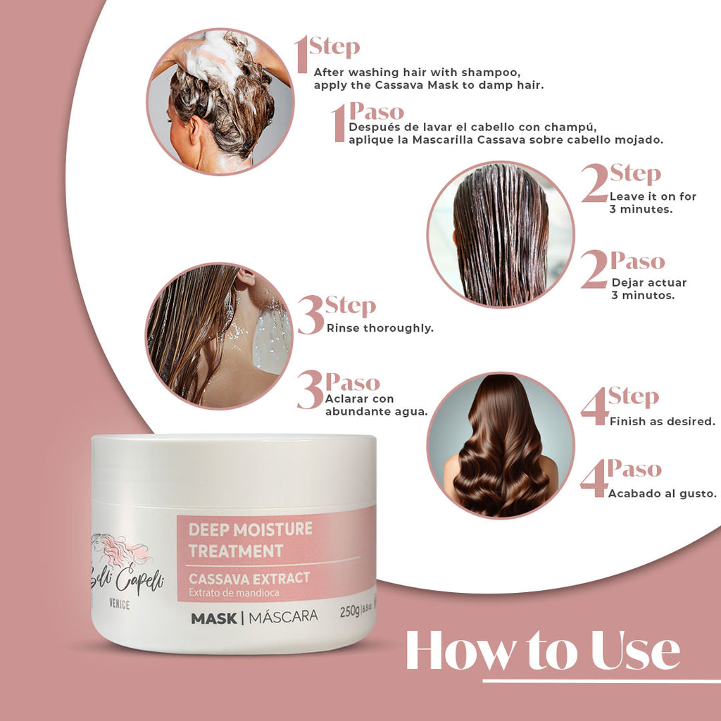 Appliquez le Masque au Cassava sur cheveux humides en massant doucement mèche par mèche. Laisser poser 3 minutes et rincer.