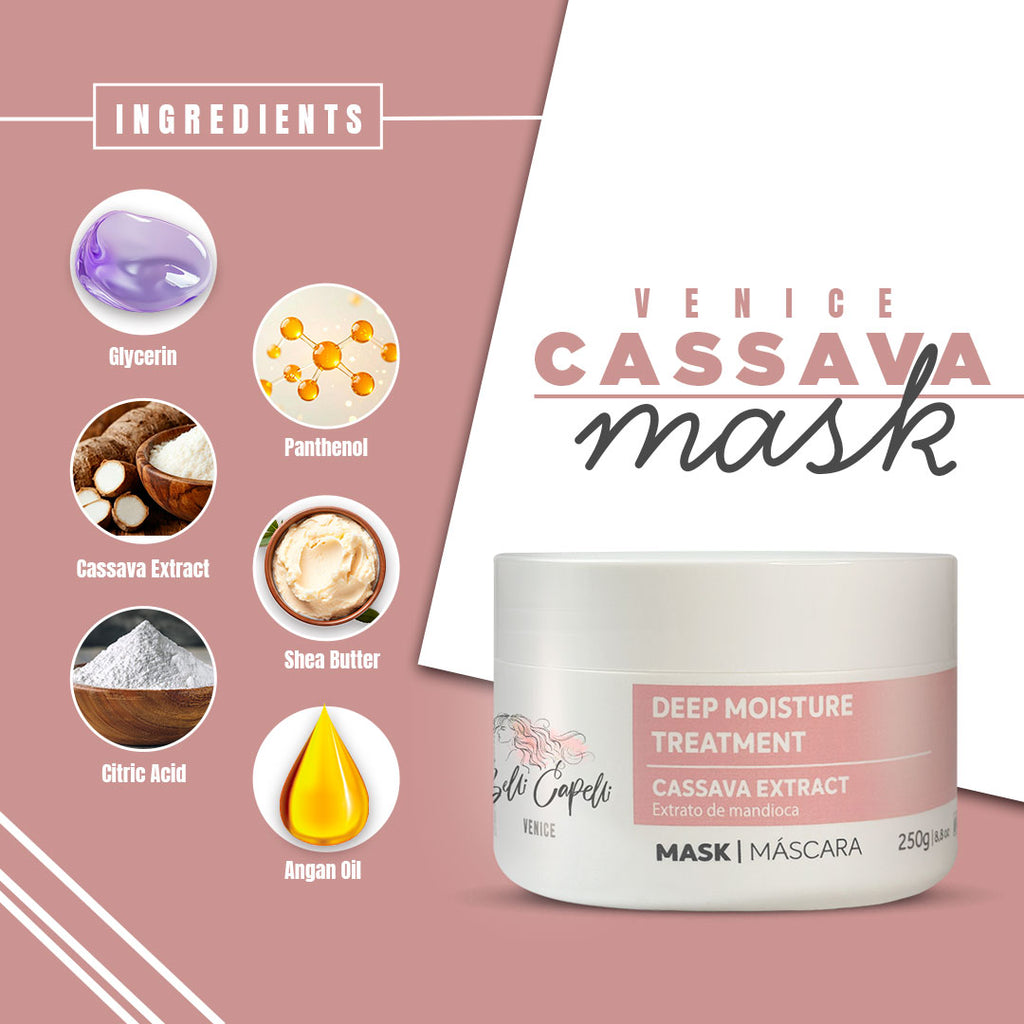 Le Masque Traitant Venise à l'extrait de manioc a le pouvoir de rajeunir les cheveux, en agissant en profondeur au niveau de la fibre capillaire. Sa formule favorise un traitement instantané nourrissant et régénérant la fibre, la laissant avec une brillance intense, hydratée et sans frisottis.