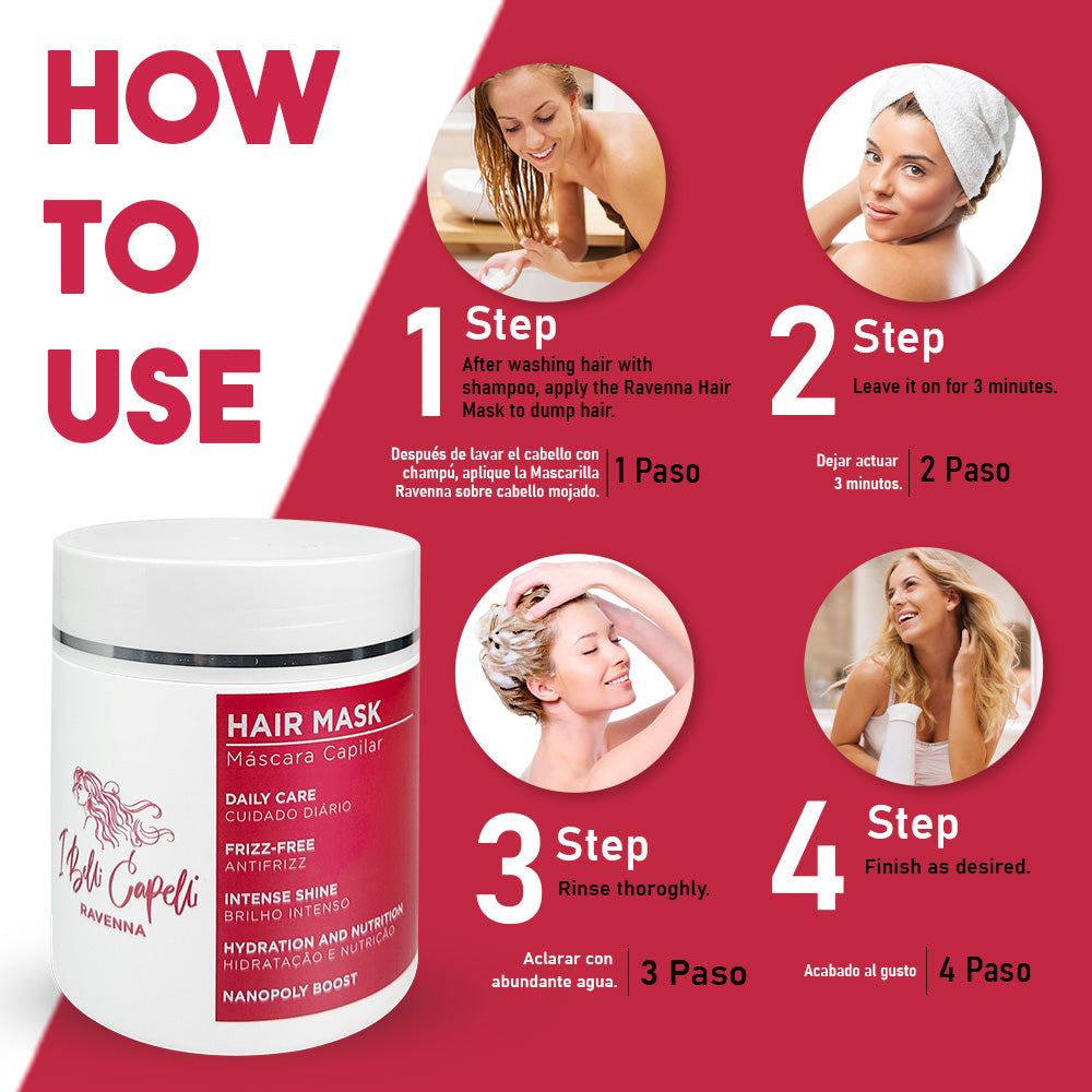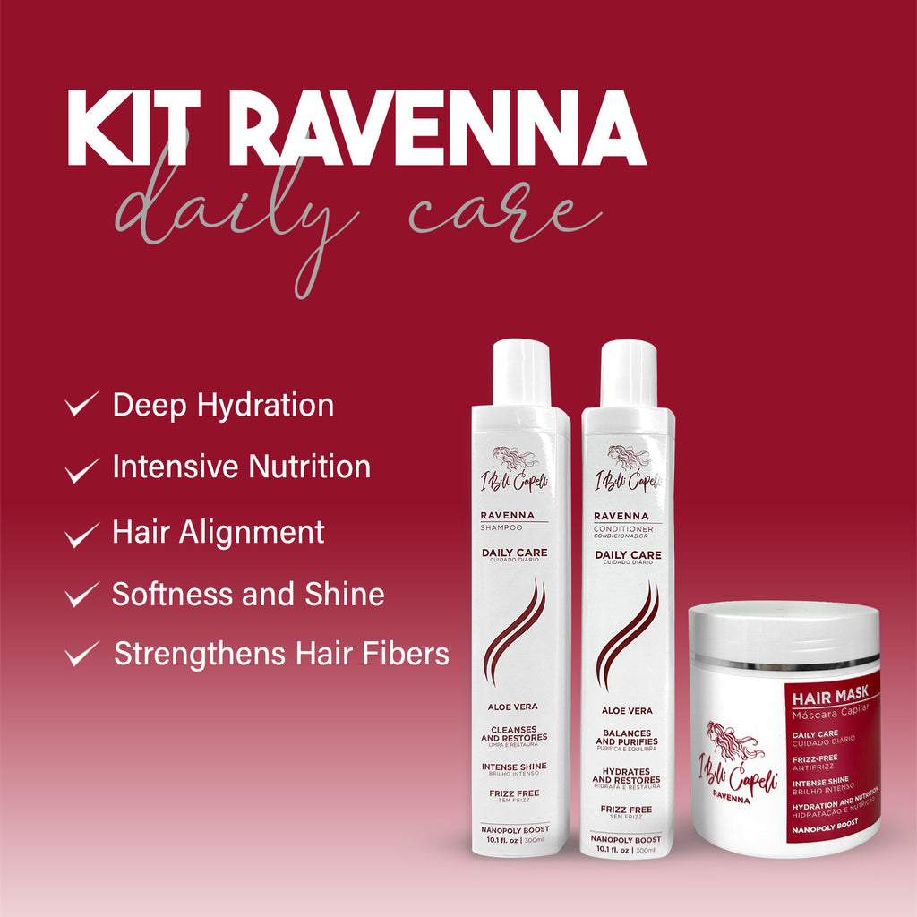 The Ravenna Daily Care Kit is the perfect solution for a complete hair care routine. Composed of Shampoo and Conditioner, along with the Hair Mask, this kit provides gentle cleansing, deep hydration, and strengthening of the strands, leaving hair softer, nourished, and with a radiant shine.